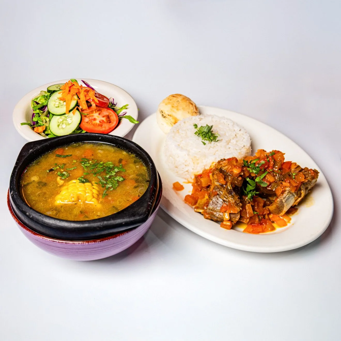It is always a good day to eat the best Sancocho de Costilla, accompanied by white rice, ribs in sauce with drowned, arepita and mixed salad.
